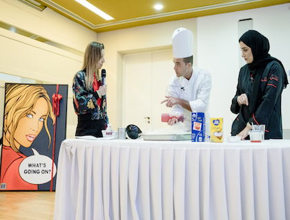 Come suggerisce il titolo, l'evento dell'11 maggio 2018 ha messo a confronto le capacità di due famosi Maestri pasticceri, la chef qatarina Ameena Musa del We Cafe Restaurant e lo chef italiano Alessandro Esposito del Paper Moon Restaurant. Gli chef hanno realizzato due dessert assai simili, la muhallabia e la panna cotta spiegando al pubblico le peculiarità e le similitudini delle tecniche di preparazione e di decorazione dei dolci dei loro Paesi. E' stata una serata di alta pasticceria e deliziosi assaggi.